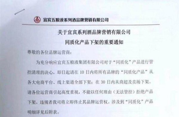 新京报讯(记者 王子扬)4月8日,落款为宜宾五粮液系列酒品牌营销有限公司的一份关于该公司“同质化产品”下架的通知显示,该公司要求各品牌运营商10日内在电商平台和线上渠道,30日内在各商超渠道下架所有品牌的共73款“同质化产品”,违规者将立即终止品牌运营授权。