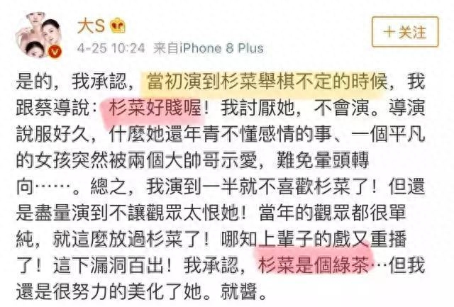 最最让我惊讶的是,就连大S也在微博中承认杉菜是绿茶,杉菜好贱....
