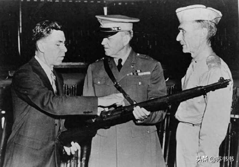 约翰·加伦德(左)来,向军方介绍他研制的M1加兰德步枪