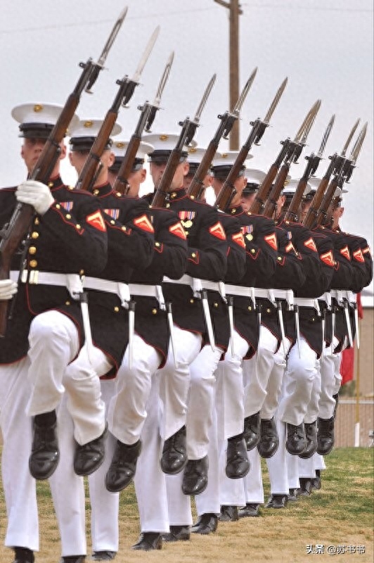 用M1加兰德武装的美国海军陆战队仪仗队。虽然1957年从美军的制式火器上下来,但仍被用作其他用途