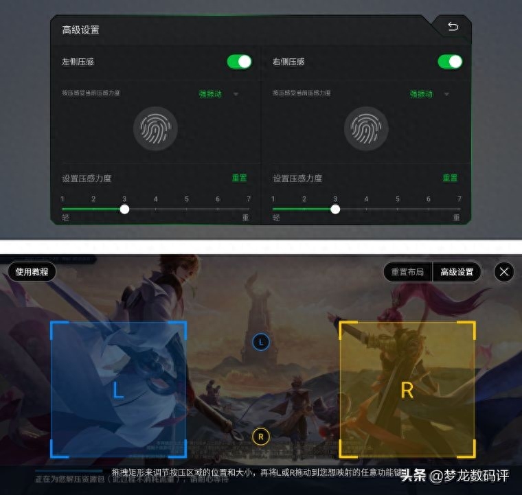 2、双区域压感触控,屏幕左右能独立设置压感操作,在SHARK SPACE的下拉菜单中可以开启。通过自定义实现王者荣耀里的左屏压感开地图、右屏压感买装备,相当于不增加外设的前提下就增加了物理按键。当然更多游戏的设置方式都可以自己发掘,可玩性很高。