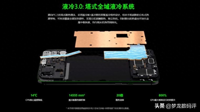 骁龙855处理器的游戏性能自不必多说,黑鲨手机2这边最大的卖点其实是液冷3塔式全域液冷系统。简而言之就是目前最大面积的液冷散热系统,能有效降低温度让处理器能更长时间的工作在全频状态下,实现长时间高强度的游戏体验。