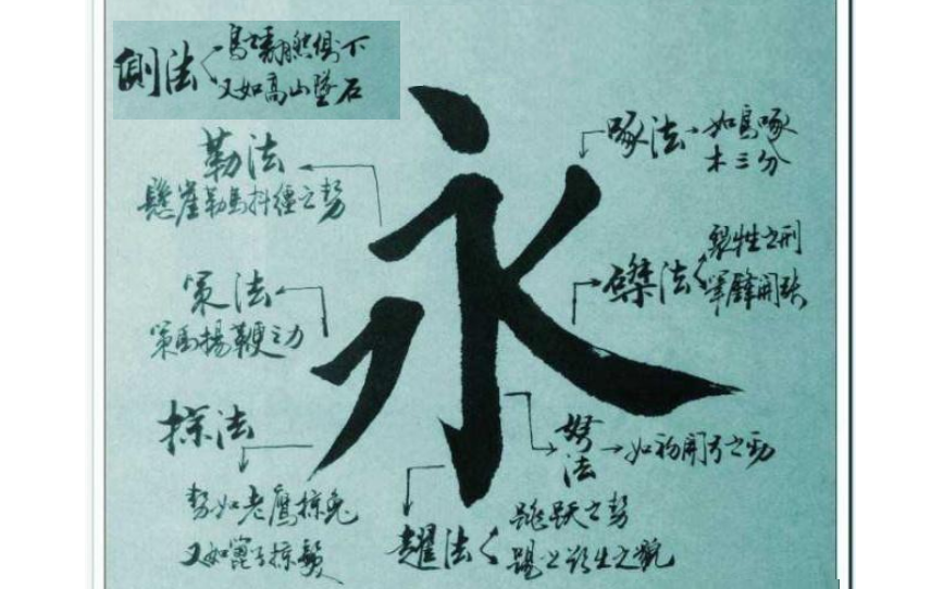 释读:纵是直画,要注意横竖之间的呼应。竖画求直,一味如横画“勒”而不纵,则歪曲无骨,失去力度。“勒”与“纵结合起来,收放自如。相反相成,则字势与力度俱全,收所谓“不平之平”及“不直之直”之效。从“不直”中求直,笔力才能入纸,才能写出真正可观的直,不显得邪曲。