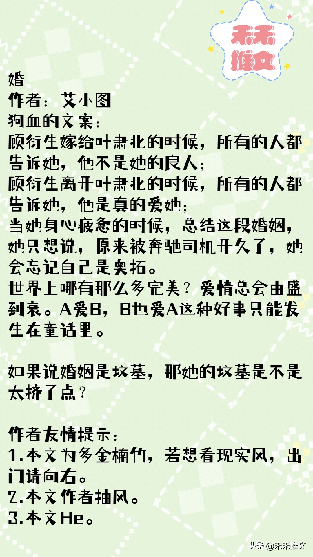 书评:艾小图的这本书很经典了,禾禾最喜欢的就是这本《婚》了。
