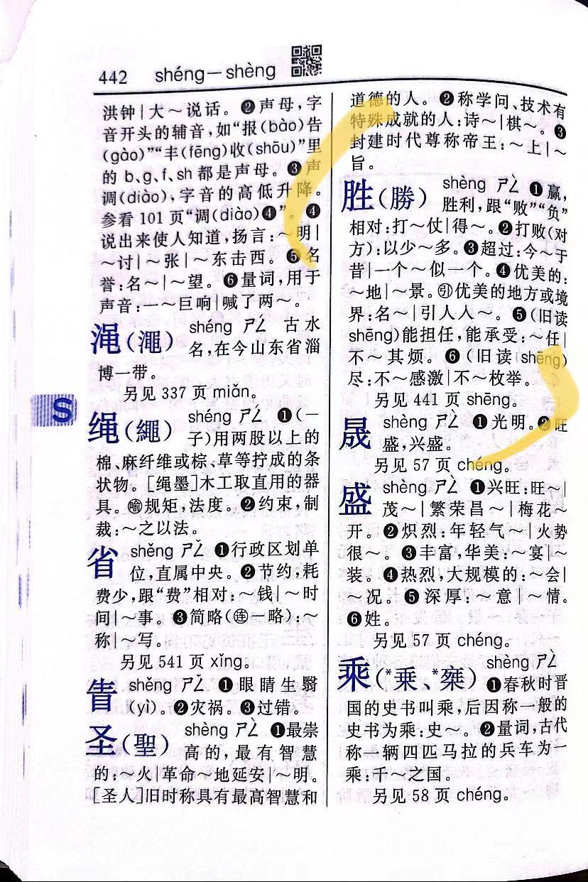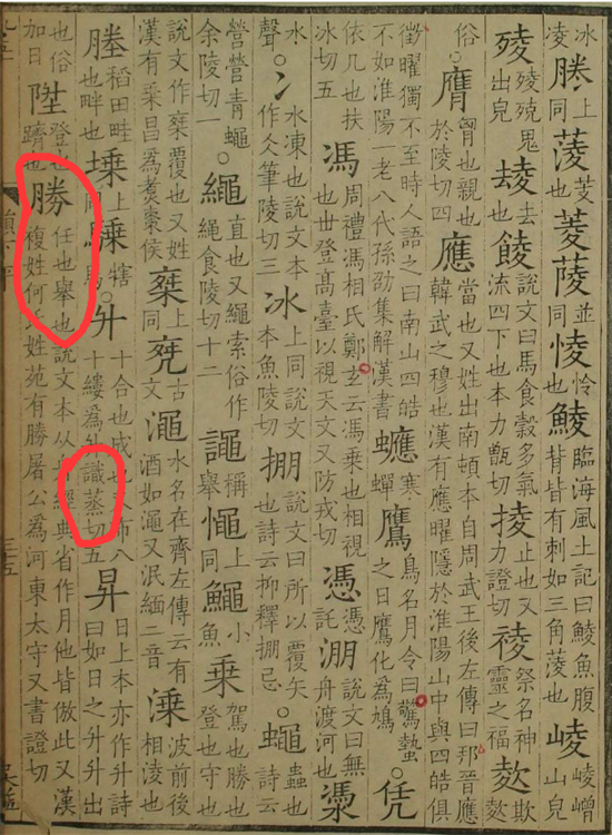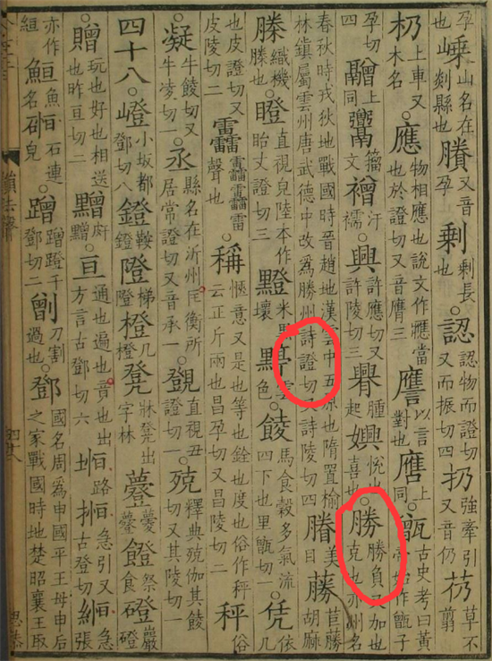 “胜负”的“胜”读shèng,是“战胜”“胜利”的意思。《广韵·证韵》“胜(勝),胜负。诗证切”,“诗证切”是古人给“胜负”的“胜”注的反切:取“诗”的声母sh,取“证”的韵母和声调èng,合在一起,就是“胜负”的“胜”的读音shèng。《康熙字典》给“胜负”的“胜”注的音是“升去声”,是说“胜负”的“胜”,与“升”声母、韵母都相同,但声调不同,“升”是平声,“胜负”的“胜”是去声,“升”的拼音是shēng,“胜负”的“胜”的拼音是shèng。
