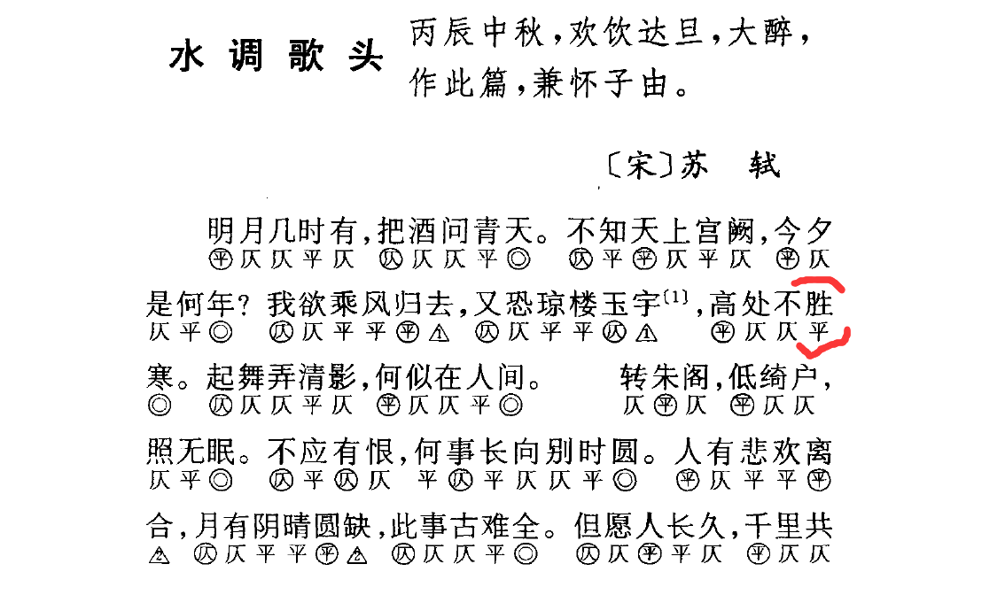 将“不胜”读成“不shèng”,在日常对话中似无不可,但在诗词诵读中会造成音律上的不和谐。《水调歌头》是词,“词”有词律,“高处不胜寒”的“胜”按词谱应读平声。“高处不胜寒”是苏轼《水调歌头·明月几时有》上阙倒数第三句,苏轼《水调歌头·安石在东海》上阙倒数第三句是“扶病入西州”,“扶病入西州”对应“高处不胜寒”,“西”对应“胜”,“西”读平声,“胜”怎能读仄声?