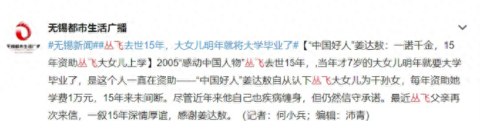 另一位“中国好人”姜达熬还把丛飞的大女儿认做干女儿,每年都打一万块钱到她的账户上,用来资助她的学习。