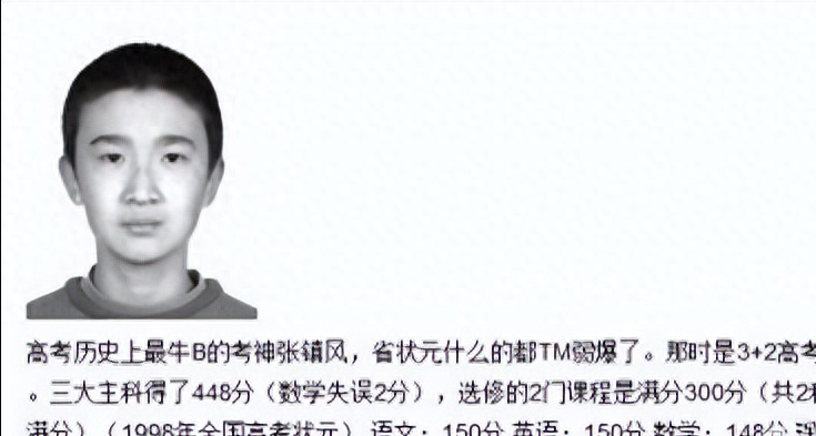 第二名是张镇风,是1998年的全国高考状元,只有数学丢掉两分,其余皆是满分。因为他的分数无限接近满分,所以事迹在高考界广为流传,被誉为“考神”。