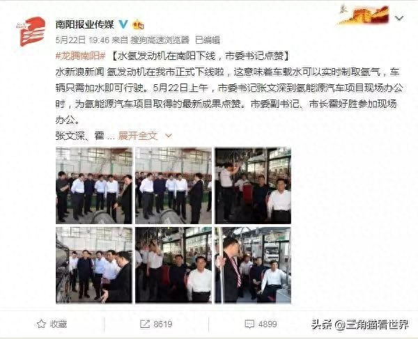 小编注意到在今年的5月22日,《南阳日报》在头版刊登了一则新闻,并在微博上发布了相关报道,称水氢发动机在南阳下线,市委书记张文深在调研氢能源汽车项目时为之点赞。《南阳日报》报道称这意味着车载水可以实时制取氢气,车辆只需加水即可行驶。