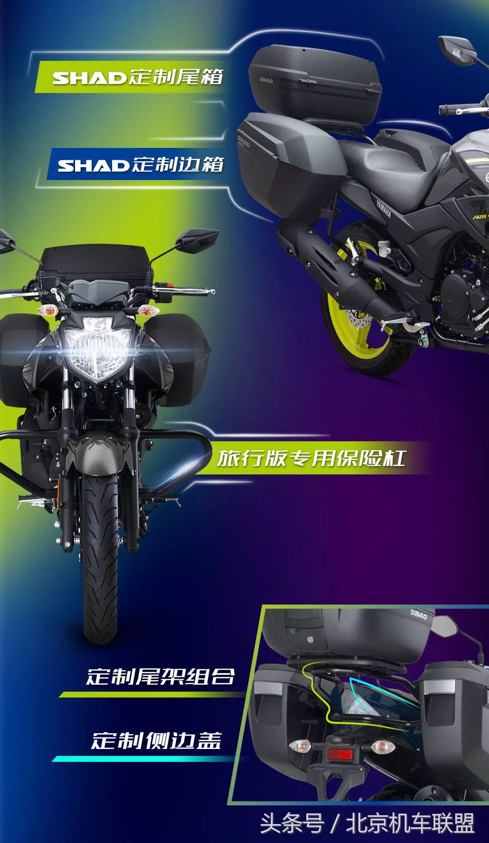 全新的飞致250不只是简单的升级改款,而是在街车的基础上,新增了旅行版、特仕版和特仕旅行版三大版本,以满足不同用户的需求。尤其值得一提的是增加了SHAD三箱,定制后尾架,前保险杠等的旅行版本,19L的超大油箱,比现行热门休旅车款DL250还要大1.7L,提供了超长续航行程,再加上飞致250固有的油耗低的特质,雅马哈飞致旅行版会是摩旅爱好者不错的旅行用车。