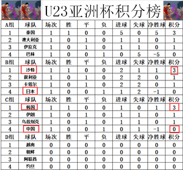 U23亚洲杯最新积分战报 中国国奥不敌韩国垫底 沙特绝杀日本