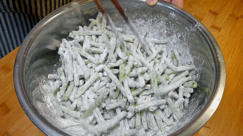 5.边加入边搅拌,一直让长豆角表面薄薄裹满一层面粉,裹的面粉不要太厚,防止豆角粘连在一起。