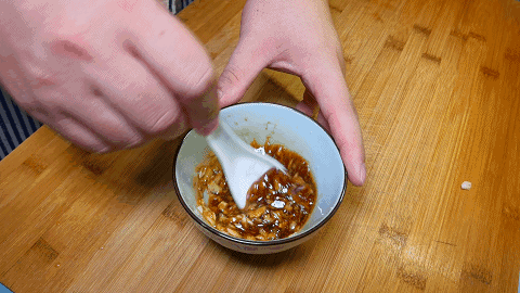 7.趁着蒸长豆角的时间,我们准备一个调料汁,大蒜几粒捣成蒜泥,再加入少许食盐、一勺生抽、两勺香醋和少许香油,把蒜泥和调料搅拌均匀。