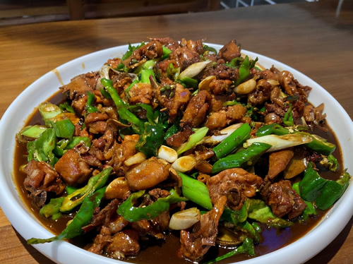 临沂的炒鸡蛋,很大一部分都是以光棍命名,其实只有一部分正宗,炒鸡选用当地的散养公鸡,肉质有韧性,一点也不柴,搭配青椒、辣椒、菜椒,连炒带焖,成菜色香味俱全,香的可口,辣得过瘾,