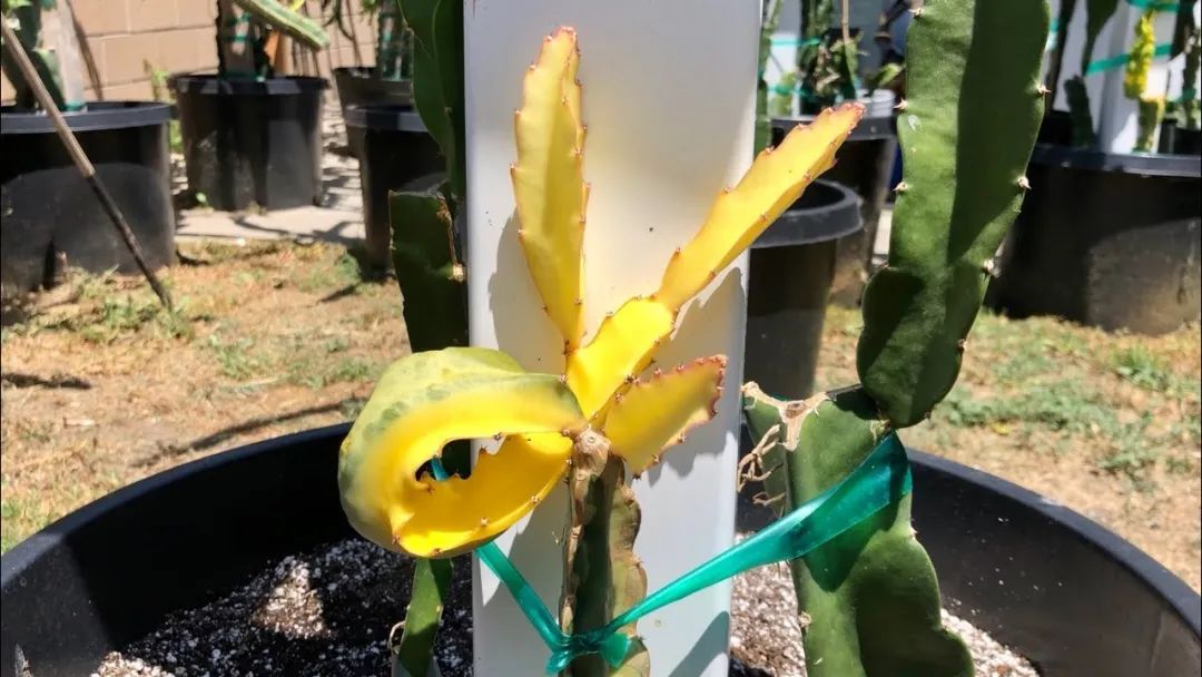 这种火龙果的正式名叫量天尺,它还有一个锦化的品种叫帝国量天尺,它的枝条是金黄色的,特别受欢迎,但是生长极其缓慢,一般都会嫁接在其它量天尺上。