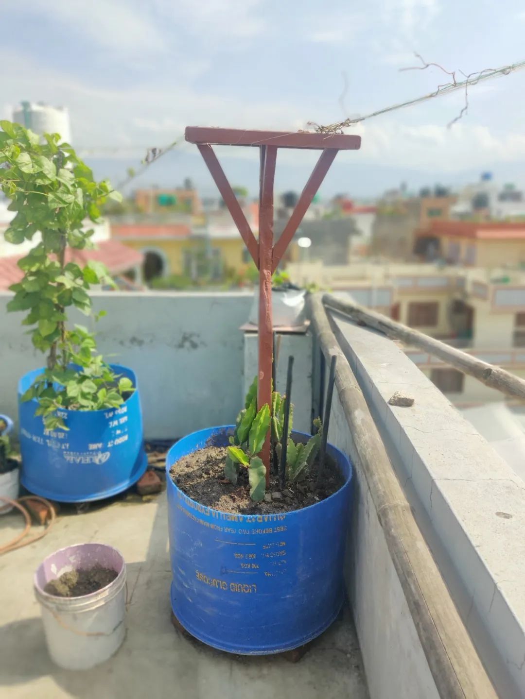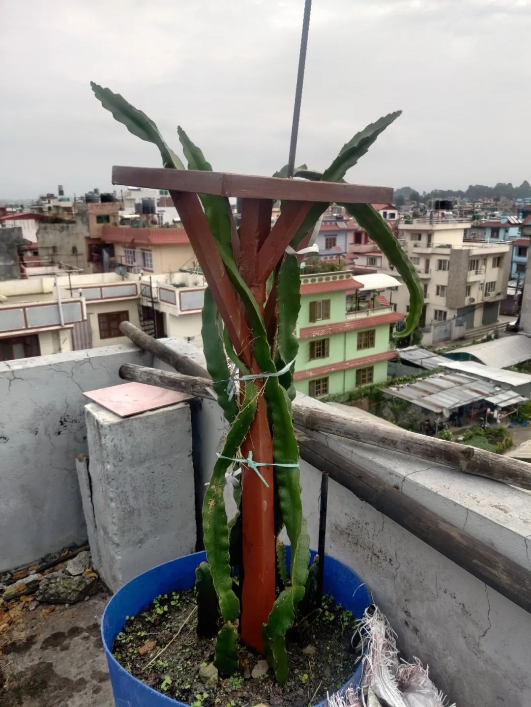盆栽养护的火龙果一般是建议提前在花盆中制作一些柱子,比如用木头,水管或水泥柱立在花盆中,在柱子的顶端可以弄一些矩形或圆形的支撑,让火龙果的枝条能够向四周低垂下来,柱子的高度有一米5到1米八就够了,太高或太低都不太适合。