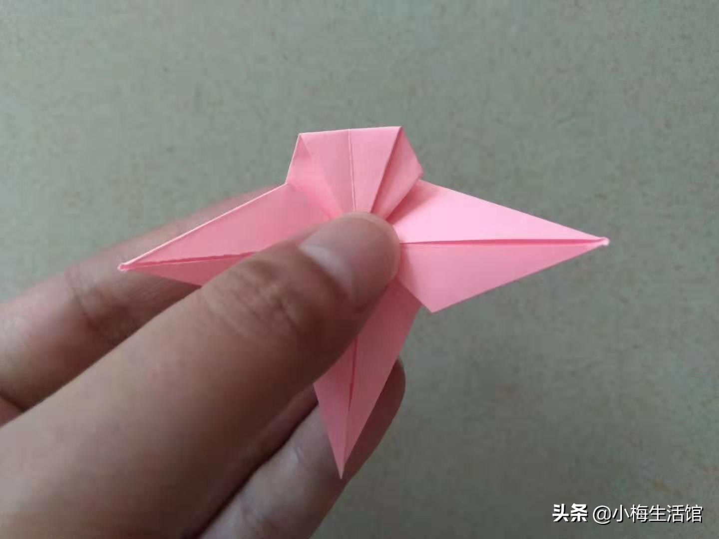 第九步:把纸整体翻过来拿在手上,把底部四个角分别以中点为基础进行对折,如图所示。