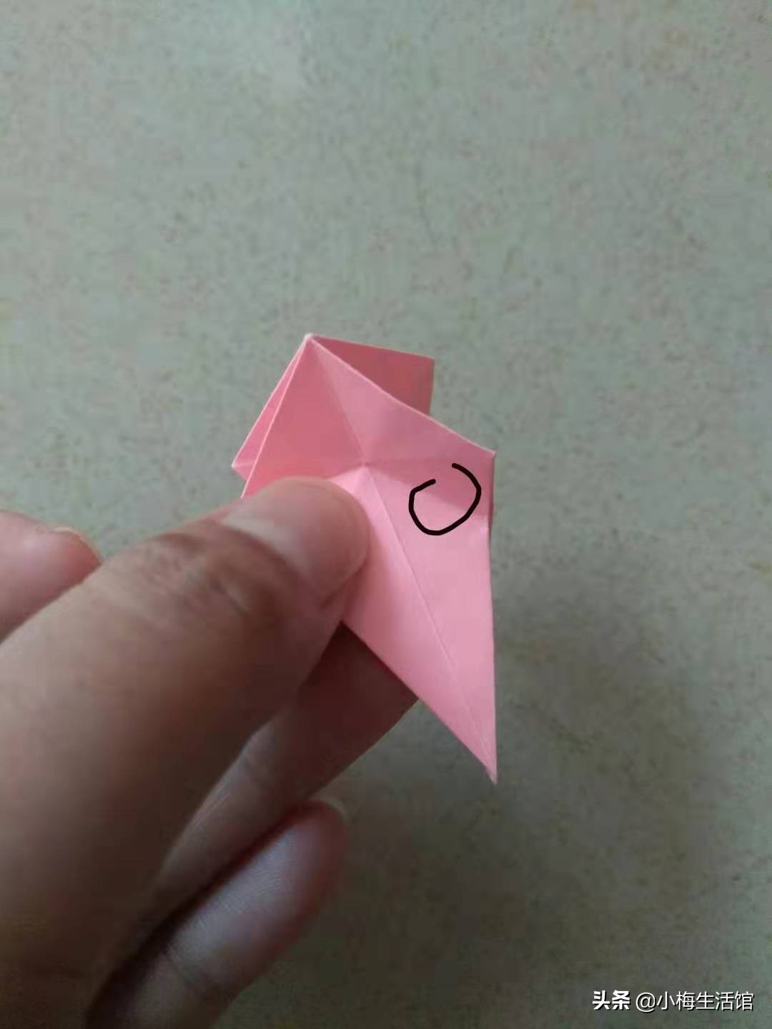 第八步:用手捏住其中一个角,把右边立起部分沿着黑色圆圈标记的折痕往下压,其他三个角依次按照这个步骤操作,如图所示。