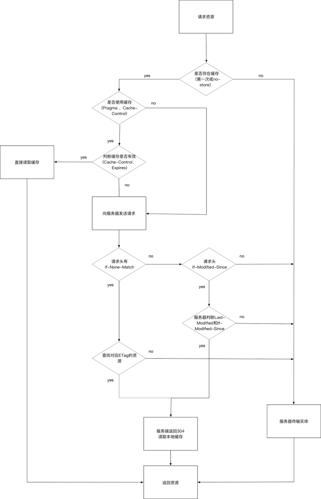 Cache-Control 与 Expires Cache-Control:HTTP1.1 提出的特性,为了弥补 Expires 缺陷加入的,提供了更精确细致的缓存功能。详细了解详细看几个常见的指令:_ max-age:功能和 Expires 类似,但是后面跟一个以“秒”为单位的相对时间,来供浏览器计算过期时间。_ no-cache:提供了过期验证机制。(在 Chrome 的 devtools 中勾选 Disable cache 选项,发送的请求会去掉 If-Modified-Since 这个 Header。同时设置 Cache-Control:no-cache Pragma:no-cache,每次请求均为 200) no-store:表示当前请求资源禁用缓存; public:表示缓存的版本可以被代理服务器或者其他中间服务器识别; private:表示只有用户自己的浏览器能够进行缓存,公共的代理服务器不允许缓存。 Expires:HTTP1.0 的特性,标识该资源过期的时间点,它是一个绝对值,格林威治时间(Greenwich Mean Time, GMT),即在这个时间点之后,缓存的资源过期;优先级:Cache-Control 优先级高于 Expires,为了兼容,通常两个头部同时设置;浏览器默认行为:其实就算 Response Header 中沒有设置 Cache-Control 和 Expires,浏览器仍然会缓存某些资源,这是浏览器的默认行为,是为了提升性能进行的优化,每个浏览器的行为可能不一致,有些浏览器甚至没有这样的优化。 Last-Modified 与 ETag Last-Modified(Response Header)与 If-Modified-Since(Request Header)是一对报文头,属于 http 1.0。If-Modified-Since 是一个请求首部字段,并且只能用在 GET 或者 HEAD 请求中。Last-Modified 是一个响应首部字段,包含服务器认定的资源作出修改的日期及时间。当带着 If-Modified-Since 头访问服务器请求资源时,服务器会检查 Last-Modified,如果 Last-Modified 的时间早于或等于 If-Modified-Since 则会返回一个不带主体的 304 响应,否则将重新返回资源。(注意:在 Chrome 的 devtools 中勾选 Disable cache 选项后,发送的请求会去掉 If-Modified-Since 这个 Header。) ETag 与 If-None-Match 是一对报文头,属于 http 1.1。ETag 是一个响应首部字段,它是根据实体内容生成的一段 hash 字符串,标识资源的状态,由服务端产生。If-None-Match 是一个条件式的请求首部。如果请求资源时在请求首部加上这个字段,值为之前服务器端返回的资源上的 ETag,则当且仅当服务器上没有任何资源的 ETag 属性值与这个首部中列出的时候,服务器才会返回带有所请求资源实体的 200 响应,否则服务器会返回不带实体的 304 响应。 ETag 能解决什么问题?