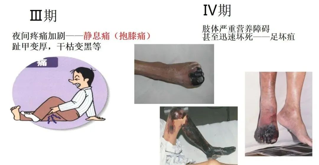 患肢缺血加重,出现肢端溃疡,严重者可发生肢体坏疽,合并感染加速坏疽。