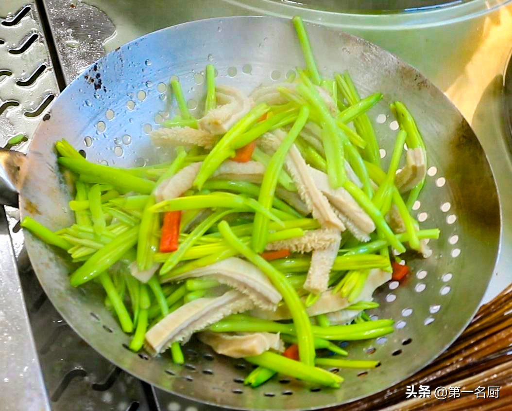 起锅添入适量清水,等水烧开后,下入处理好的黄花菜和青红椒,焯水半分钟后,下入牛肚丝,一分钟以后倒出控水。