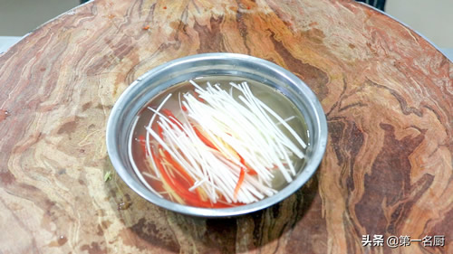 4.在蒸鱼的这个时间,准备大葱半根切成葱丝,生姜一块,切成姜丝,红椒半个切成细丝,一起放入盆中,用来配色,加入适量清水,使葱姜丝吃起来口感更脆。