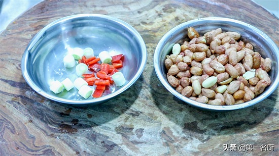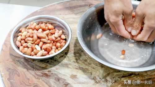 花生米半斤左右,放入盆中加入清水,再加入一勺食盐,用手拌匀浸泡5分钟,这一步是为了清除花生里面的杂质,也能使花生米更脆,然后把花生捞出沥干水分,放在另一个小盆中备用。