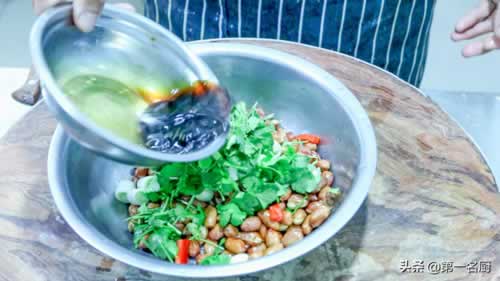 准备一个小盆,加入食盐2克,味精1克,白糖1克提鲜,陈醋10克,生抽10克调味,用勺子搅拌化开调料,,再把花生米倒入拌菜盆中,放入大葱和红椒,加入香菜段,倒入调好的料汁,用勺子搅拌均匀,装盘就可以上桌食用了。