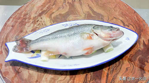 大葱两段从中间切开,生姜一块切成姜片,再把葱段和姜片垫在鲈鱼的下面,这样可以使鲈鱼在蒸制的时候受热均匀。