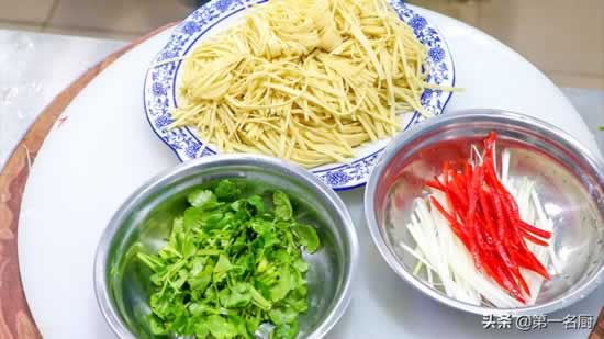 煮熟的牛肚丝半斤左右,新鲜的黄花菜3两左右,去掉里面的内芯,放入盘中,青红椒各半个切成细丝,大葱切成葱花,生姜切成姜片,大蒜几粒拍扁一起放入盘中备用。