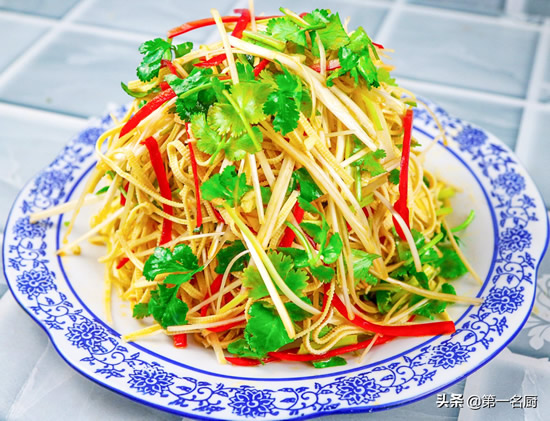 准备豆腐皮三张,用刀切成细丝,放入盘中备用,取香菜几根洗净后,切成段放入盆中,大葱切成两段,再切成葱丝放入盆中,红椒半个去瓤,切成红椒丝,和葱丝放在一起,大蒜几粒,依次拍扁切成蒜末。