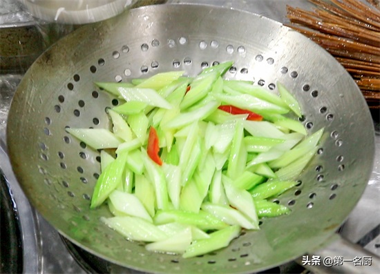 起锅添入适量清水,加入一勺食盐增加芹菜的底味,再加入少许植物油,水开后下入西芹和红椒,焯水30秒,即可捞出控水拔凉,放入盘中备用。