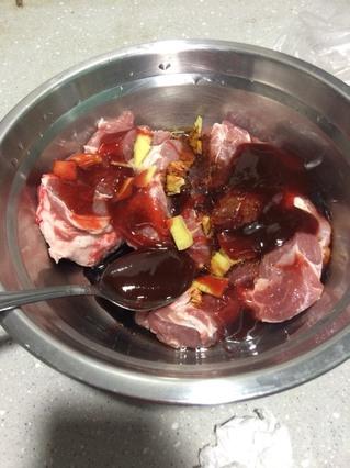 1,把梅头肉洗干净,切成约2厘米厚的大块,放入适量的食盐、生抽、老抽、五香粉、料酒抓匀,接着再放入5勺叉烧酱,叉烧酱一定要多放点,把每一块肉片都沾上厚厚的叉烧酱。