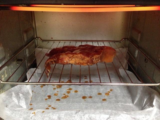 烤制20分钟后取出,翻面,另一面也刷上腌制酱,再刷一层蜂蜜,接着放回烤箱中继续烤20分钟。