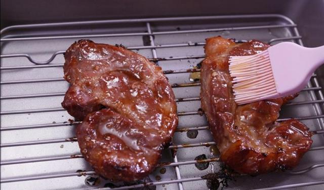 烤20分钟后,再往猪肉上多刷点蜂蜜,两面都涂抹厚一点蜂蜜,放回烤箱继续烤3分钟就可以了。