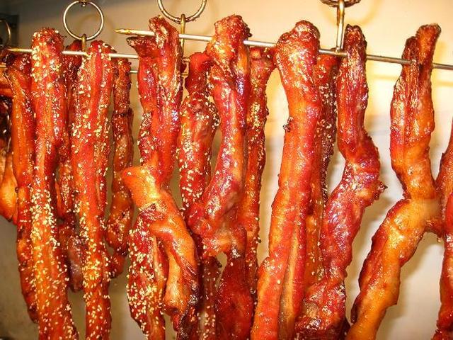做了30年粤菜的大厨(也就是我爸爸)告诉我,叉烧,是将腌制好的猪肉用叉子放在火上烧熟而得名。以前人们都是用全瘦的里脊肉烧制而成,但发现全瘦的里脊肉在烧的过程中会变得干枯,后来便将里脊肉改成五花肉。五花肉肥中带瘦,瘦肉中夹着肥肉,用五花肉烤出来的叉烧口感特别好,肥而不腻,焦香软糯。在五花肉上涂抹饴糖,在五花肉制的过程中。五花肉分解油脂和饴糖,从而使得做出来的叉烧不会干枯,甜蜜而又散发着芬芳的味道。