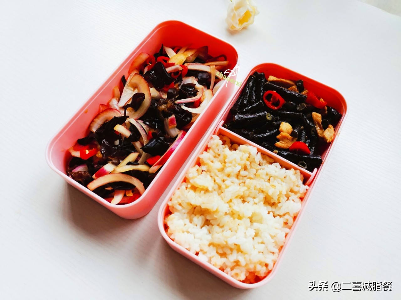 具体做法点击链接可查看:减脂午餐day7:糙米饭+木耳拌洋葱+鸡丝炒紫豇豆