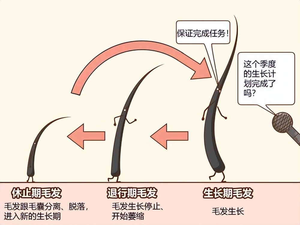 ,主要分为生长期、退化期、休止期。头发在正常状态下,1个月可以生长1cm左右,但并非恒定不变,其又受遗传及内分泌调控。同时根据人体新陈代谢不同,头发生长和脱落的周期也存在不同。