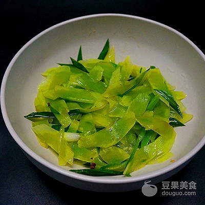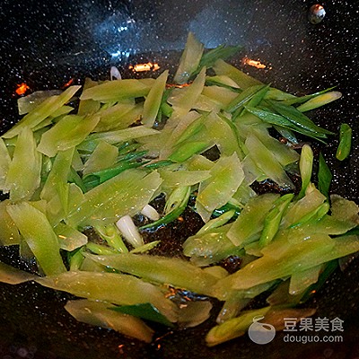 7、锅里放入少许油,倒入刚切好的莴笋片和蒜苗段爆香,时间不用太长,如果你怕等下垫底儿不能入味儿可以放入一丢丢盐,千万别多啊,等下汤里也有咸度
