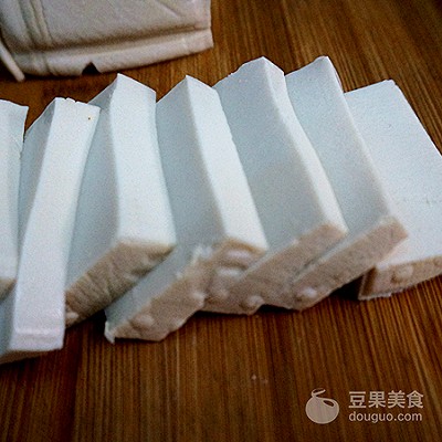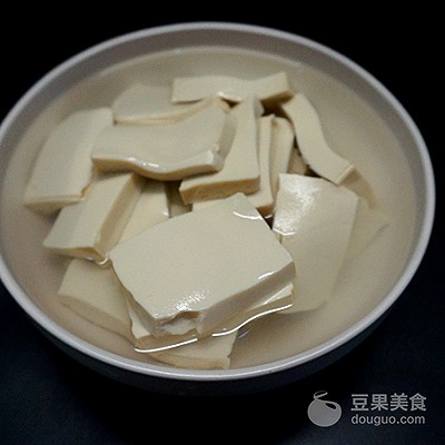 2、豆腐切成大小均等的块儿,不建议切得太大太厚,一是不容易入味儿, 装盘也不好看