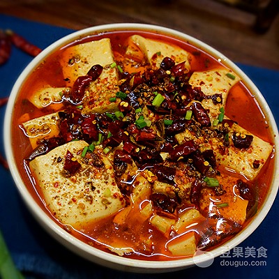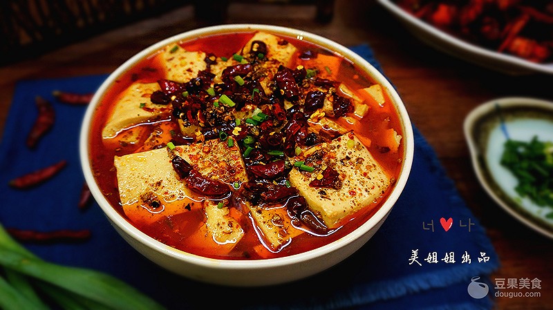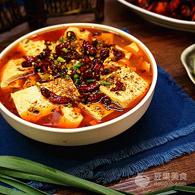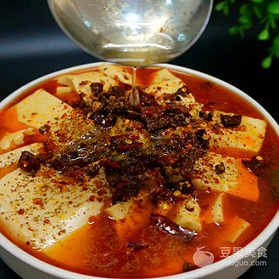 21、豆腐连汤倒入刚刚盛有菜的碗里,在撒点花椒粉,辣椒粉之前炸香的辣椒花椒碎