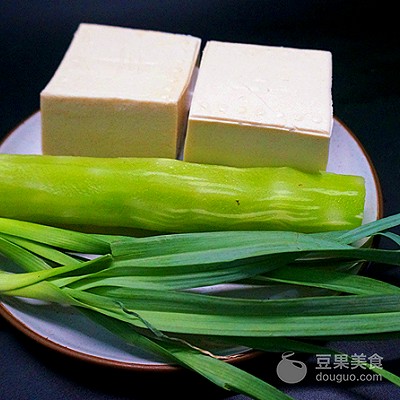 1、准备好需要的材料,我今天用的嫩豆腐,如果还是新手建议用老豆腐不容易碎一点,但是呢本宫觉得嫩豆腐口感好哈哈 莴笋可以换成其他的