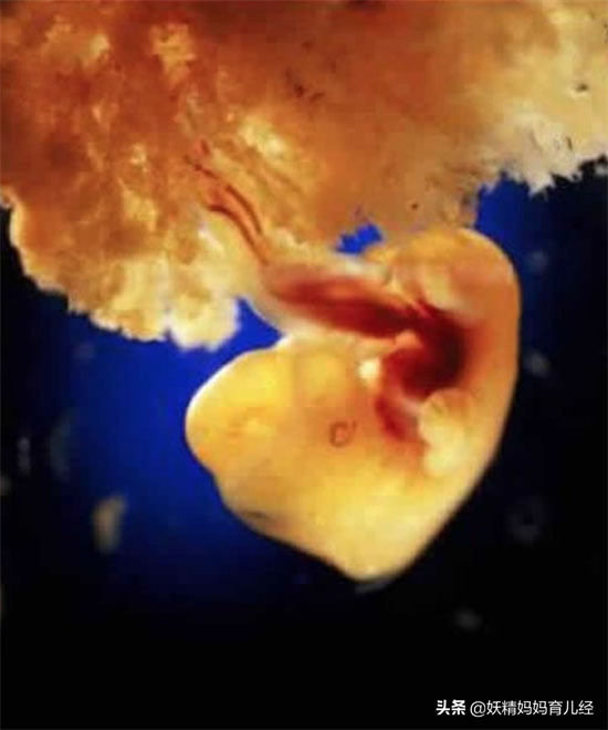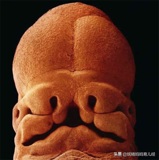 10、怀孕的第五周,胎儿的五官开始发育,眼睛、鼻子、嘴巴有了初步轮廓。太丑了,太丑了,有点像外星人。