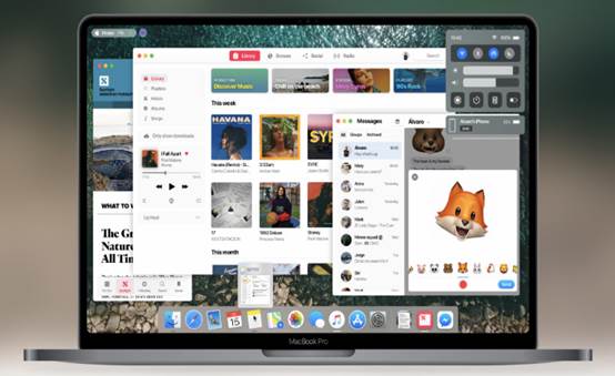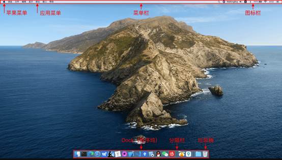 MacOS顶部是菜单栏,顶部左侧苹果菜单包含了常用操作选项,包括查看系统信息、开机、关机、系统偏好设置等;