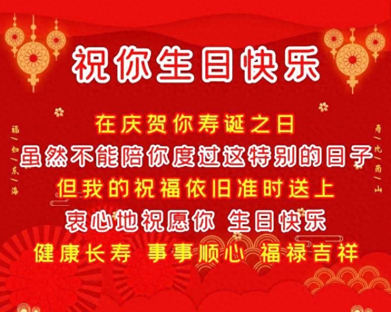 4、在庆贺你寿诞之日,虽然不能陪你度过这特别的日子,但我的祝福依旧准时送上,衷心地祝愿你:生日快乐!健康长寿,事事顺心,福禄吉祥!