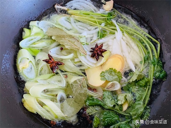 食材:(洋葱、大葱、生姜、香菜)、八角、花椒、香叶、植物油
