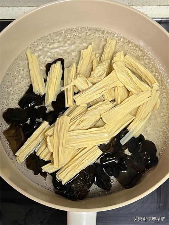 ②、泡软泡胀后切小朵,起锅烧水,水开下入腐竹木耳,煮上几分钟,煮熟后捞出。