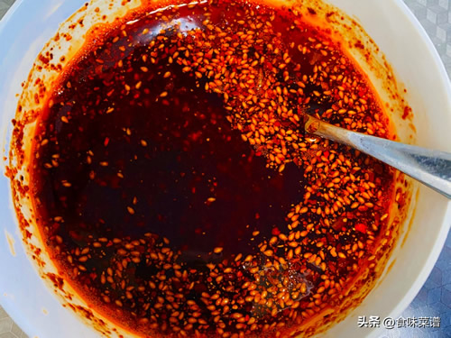 6、按照这个方式炸的辣椒油,颜色又红又亮,没有任何的添加剂,香辣开胃,浓郁上瘾,不是单纯的辣,辣中透着香,极具穿透力,让人欲罢不能,这样一盘辣椒油,用来调个小凉菜,味道简直太“哇塞”了。