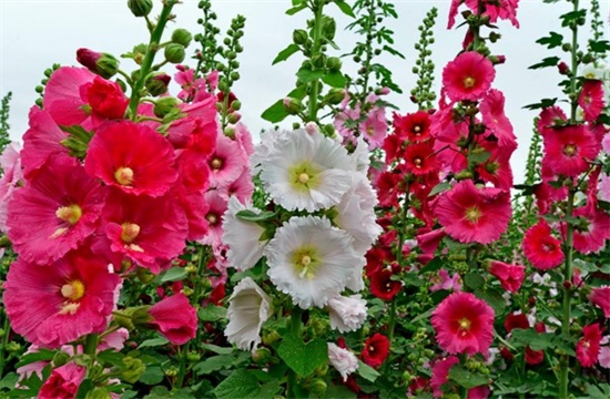 蜀葵又叫一丈红,属两年生草本植物,植株可高达2米,到了夏天茎干上开满各种颜色的漂亮花朵,很适合栽植在院子里或大门口观赏。
