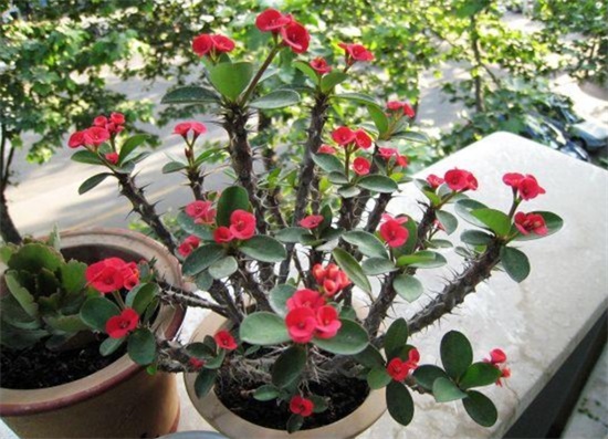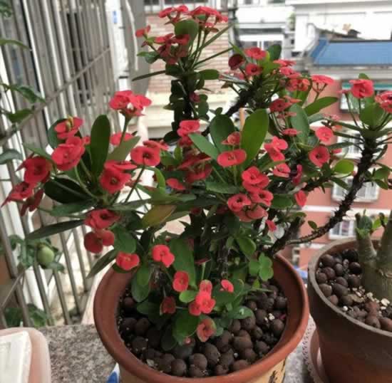 虎刺梅是非常喜光的植物,夏天也不怕晒,完全可以放在外面养护,浇水不用太频繁,做到干透浇透即可,在气温不是很高的情况下。可以适当给它施一些磷钾肥,可促进植株孕蕾开花,让它开花更多更艳。